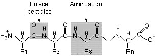 Como consecuencia del establecimiento de enlaces peptídicos entre los distintos AA que forman la proteína se origina una cadena principal o "esqueleto" a partir del cual emergen las cadenas laterales de los AA. Los átomos que componen la cadena principal de la proteína son el N del grupo amino (condensado con el AA precedente), el C (a partir del cual emerge la cadena lateral) y el C del grupo carboxilo (que se condensa con el AA siguiente). Por lo tanto, la unidad repetitiva básica que aparece en la cadena principal de una proteína es: (-NH-C -CO-).